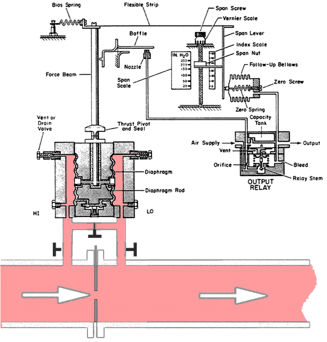 The principle of this flow measurement is the pressure drop across the OrificePlate is proportional to the flow rate. The pressure drop is measured by a differentialPressure transmitter and converted to flow indication.